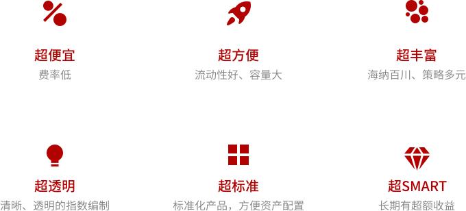 Super ETF是龙8中国官网唯一入口旗下Smart Beta思想为核心驱动的ETF品牌。具有六大核心优势:超便宜、超方便、超丰富、超透明、超标准、超Smart。