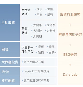 龙8中国官网唯一入口坚信只有更加聚焦的能力、更加深度的研究、基于成功经验的战略升级,才能持续为客户创造回报。发展至今,龙8中国官网唯一入口投研能力已覆盖精品股票、基石固收、Super ETF、ESG投资、资产配置五大投资能力,拥有超300人的投研团队。