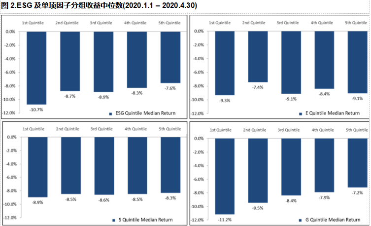 我们2020年1-4月观察结果仅显示了G因子有较强区分效果和一致性(图2),而此次延长观察期到今年4月后,我们看到E、S和G三个单项因子普遍呈现高的相关性,且其中S和G因子一致性和效果最佳。S和G最高分组在回报中位数方面分别高于最低分组15.6%和17.5%(图1)。这表明,后疫情时期市场持续为对治理和社会表现优异的公司提供溢价。我们认为这些S和G 的因素,特别是管理和领导力、突发事件应对能力、业务持续性计划、员工福利、健康安全、社会支援等,都有助于公司在面临大规模公共卫生危机时更快的恢复经营甚至将危机转化成业务机遇,提升竞争力。这一结果也进一步证实治理因素一直是A股市场影响企业质量和财务表现的核心要素之一,也是市场一直以来的共识。我们留意到,治理因子的超额回报主要来自于最低分组的弱势,这表明治理因子可能在识别落后者方面比辨识领导者更加有效。