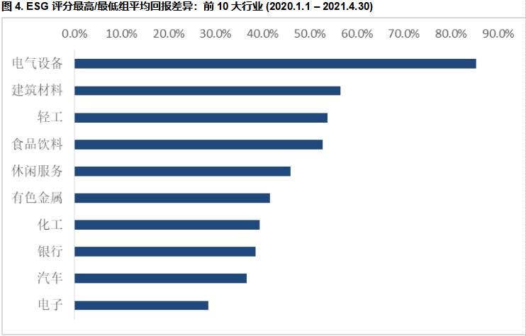 我们观察到,在28个申万一级行业中的24个中, ESG行业领先者(ESG评分最高20%组)都在一定程度上跑赢了落后者,ESG行业领先者优势最大的前十大行业中,平均收益的优势在28.4%到85.2%之间,其中分度最明显的是电气设备,建筑材料,轻工行业和食品饮料,如图4所示。