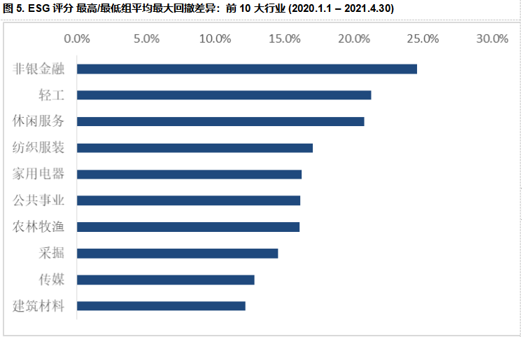 我们进一步分行业(申万一级行业)对ESG分组后的平均回报和回撤进行分析。我们认为,ESG因素与公司的长期基本面、经营模式的可持续性以及财务健康息息相关, ESG评分较高的公司一般表现出更高的质量、经营稳定性和持续性,而低评分公司则更倾向于在这些方面有更高的风险暴露。因此,我们分行业来观察ESG评分最高和最低组在平均回报和平均最大回撤方面的差距,以此来分析ESG评分在不同行业内的区分能力。