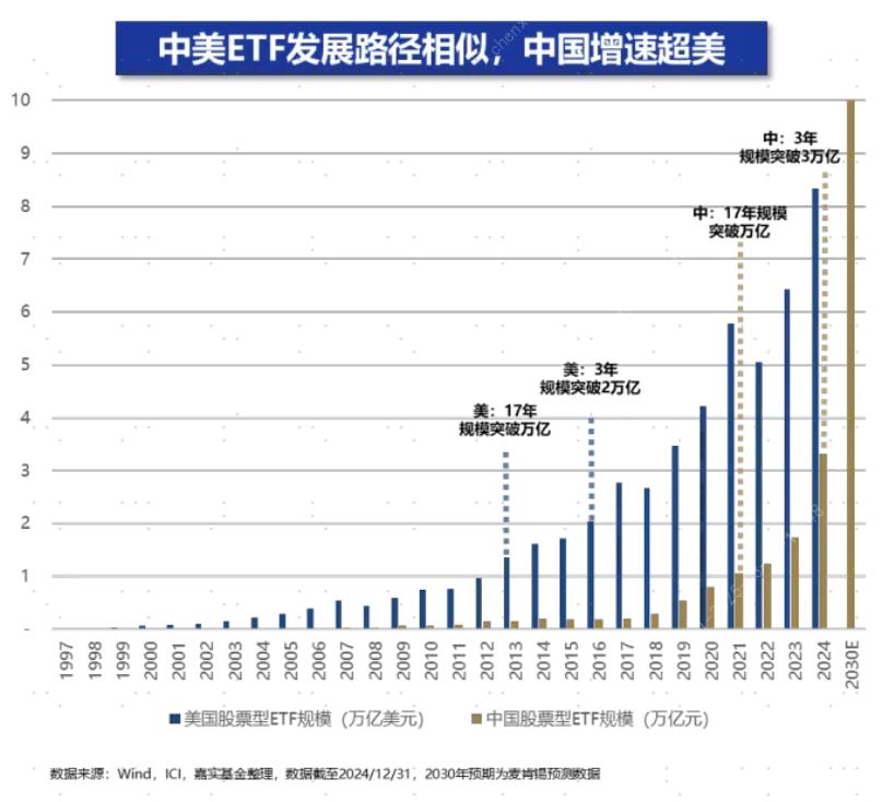 以权益类ETF为例,美国市场用17年突破万亿规模,又用了3年破第二个万亿,截至2024年末,美国ETF市场规模高达8万亿美元。中国市场同样用17年实现首个万亿,但仅用3年便突破三万亿,增速远超美国,发展势头迅猛,背后是多重因素合力推动。