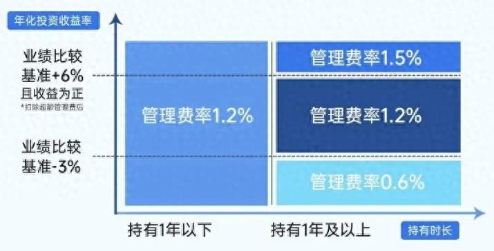 (注:具体费率标准以基金合同约定及实际情况为准。持有期限不足一年(即365天,下同),则按1.20%年费率收取管理费;持有期限达到一年及以上,则根据持有期间年化收益率分为以下三种情况,分别确定对应的管理费率档位:若持有期间相对业绩比较基准的年化超额收益率(扣除超额管理费后)超过6%且持有收益率(扣除超额管理费后)为正,按1.50%年费率确认管理费;若持有期间的年化超额收益率在-3%及以下,按0.60%年费率确认管理费;其他情形按1.20%年费率确认管理费。)