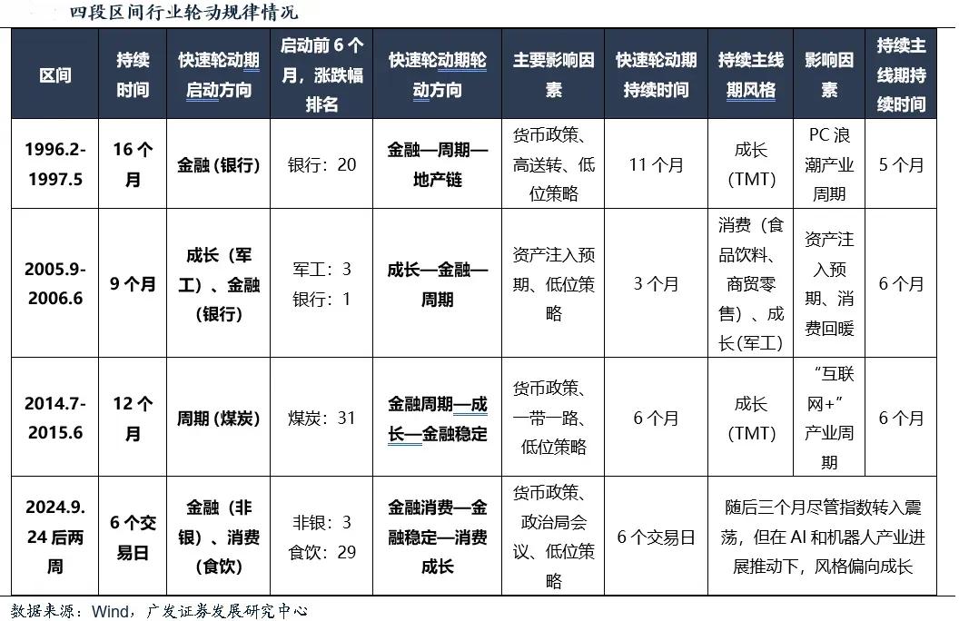 广发证券复盘了过往四次基本面尚未企稳、由流动性驱动的牛市,总结区间行情的轮动可以分为两个部分——快速轮动期和持续主线期。