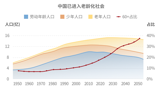 预计到2050年,我国60+人口将达到35%左右,老龄化压力大。